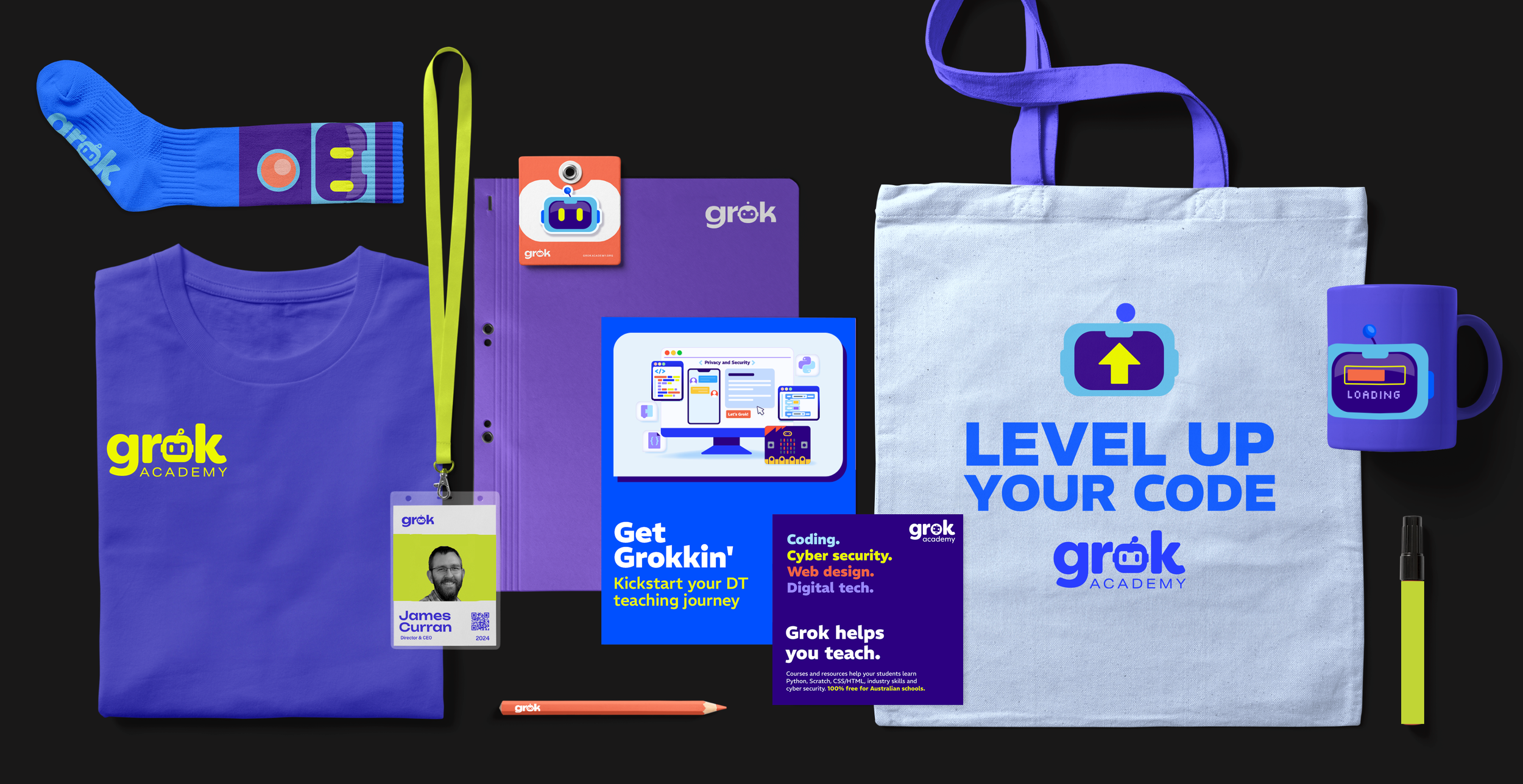 Grok Swag • As part of Grok’s rebranding exercise, I explored these options for event “swag”. Grok Academy made regular appearances at large scale events and conferences, and there was a steady demand for promotional materials to raise the non-profits profile amongst potential customers and partners.