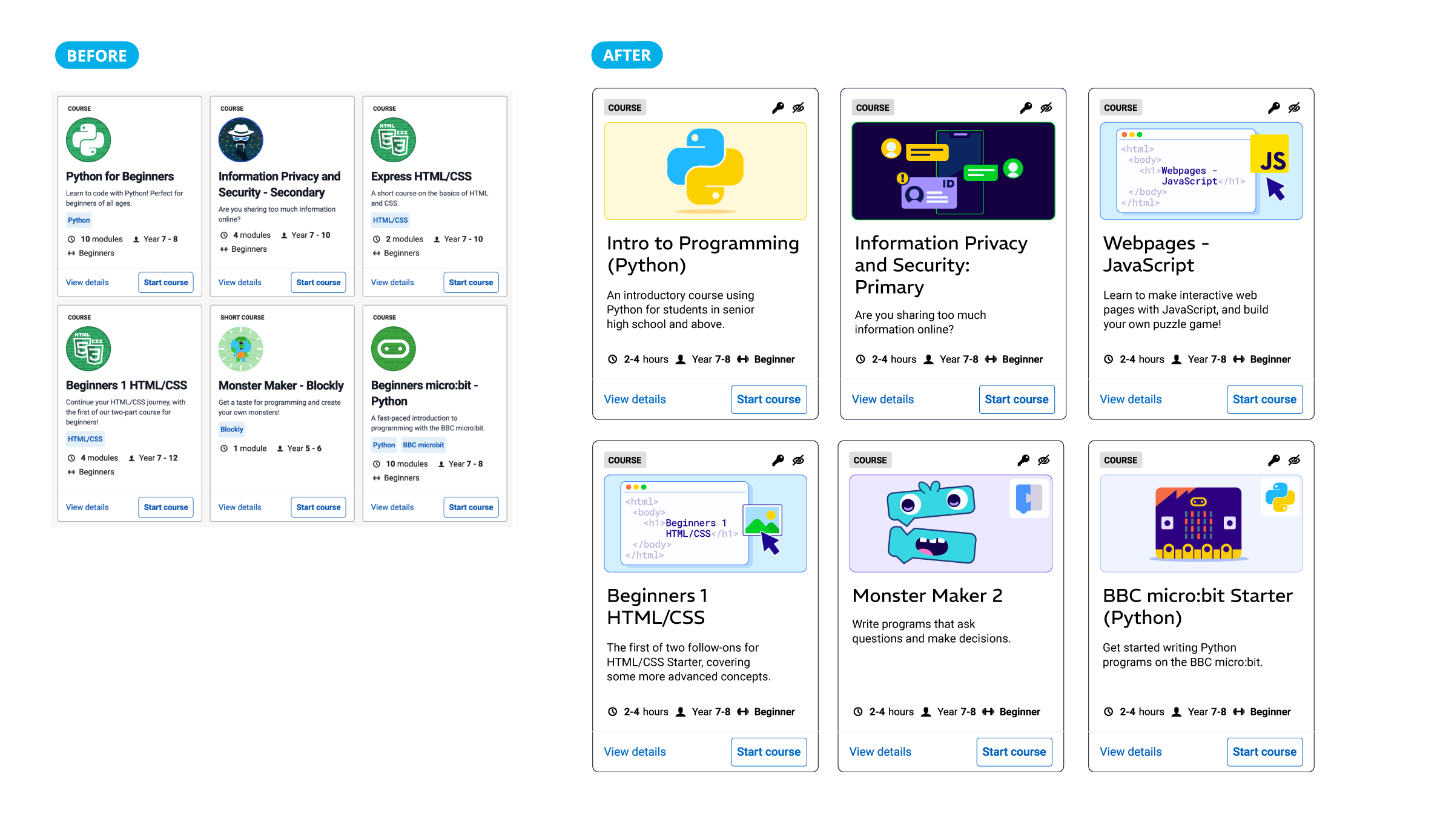 Home Page Redesign • My final (and regrettably unfinished) project with Grok Academy was a substantial brand refresh. I nominated new colours, type choices and was working on a cohesive graphic and animation style guide when funding issues meant Grok – an edtech non-profit – suddenly needed to dramatically shed numbers. This home page before/after shows the direction we were moving in.